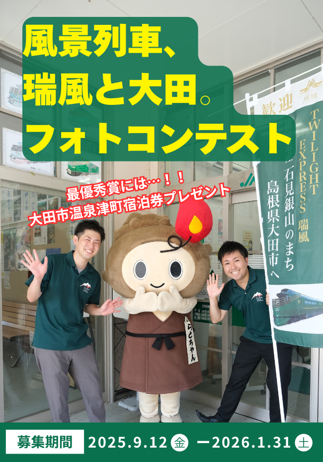 大田市内の山陰本線を走行する「TWILIGHT EXPRESS 瑞風」と、大田市内に広がる海と山、町並みなど、見る人の心に残る“山陰の原風景”を撮影した写真を募集しております!